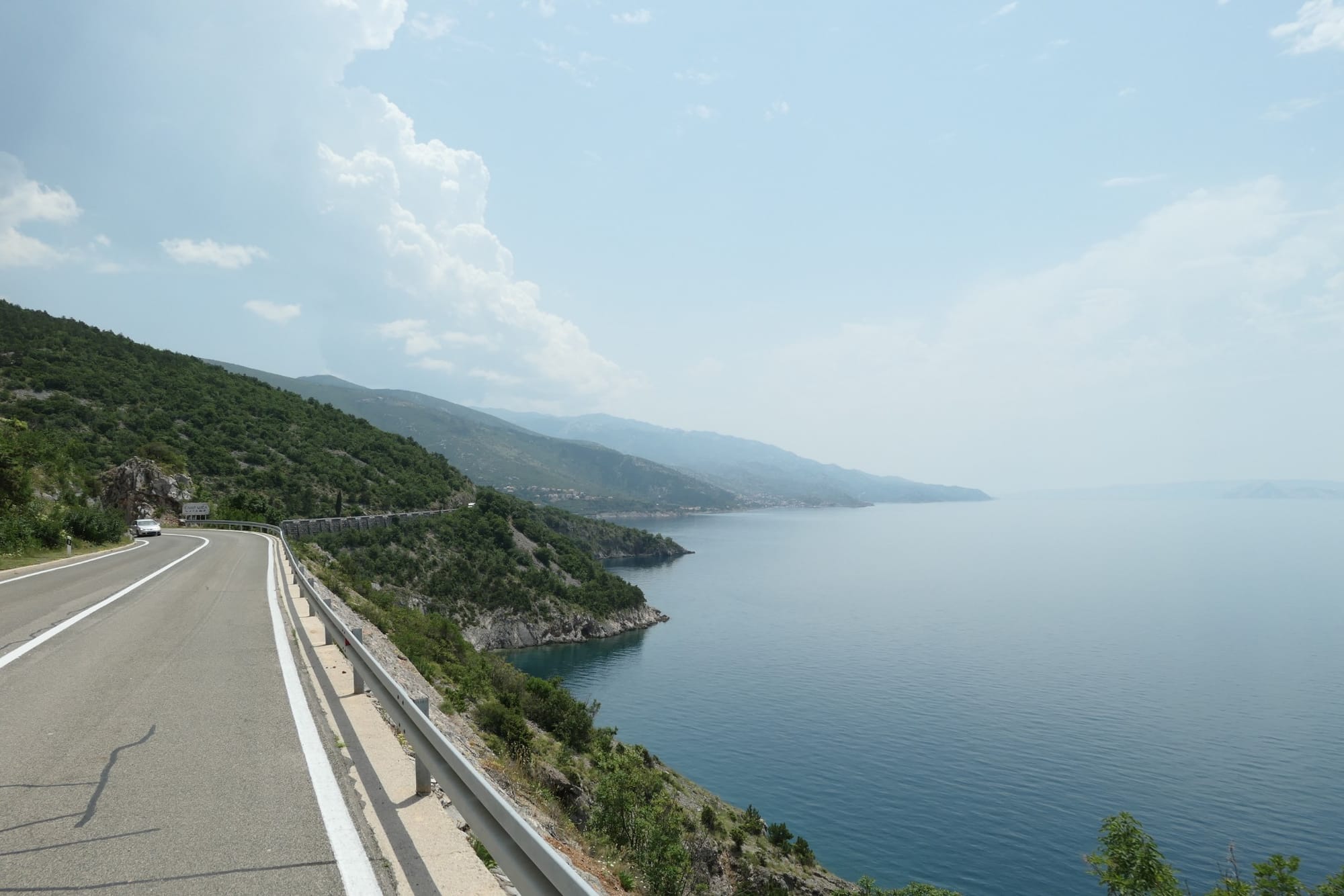 11.6.: Früher als sonst machten wir uns zu Fuss auf nach Krk um am Meer zu Frühstücken und die Altstadt zu besichtigen. Diese hat sehr viel charme mit engen Gässchen, sie gefiel uns auf den ersten Blick - sehr empfehlenswert. Vor dem Mittag fuhren wir los, zurück über die Brücke (dieses Mal kostenlos) am Meer entlang bis nach Starigrad-Paklenica auf den bluesun Camp Paklenica. Diese Strecke ist wunderbar, mit vielen schönen Kurven und immer mal wieder sehr nahe am Meer mit Ausblick auf die Inseln Krk, Rab und Pag. Sozusagen die Great Ocean Road von Kroatien - Great Adria Road.