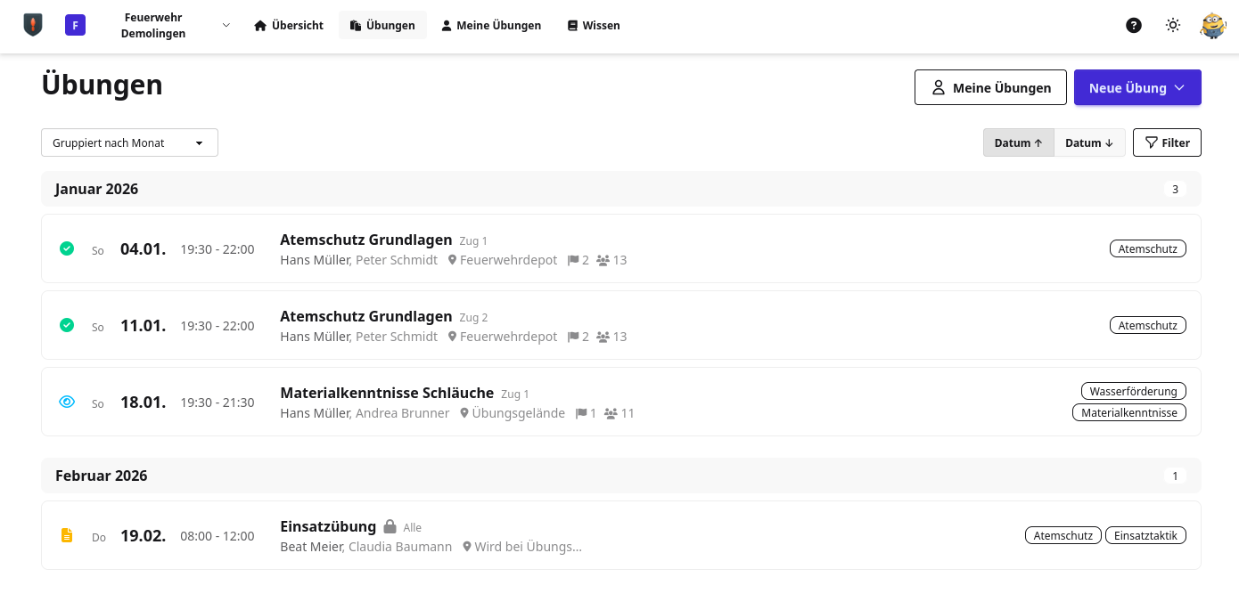 Stell dir vor, du planst eine Atemschutz-Übung. In Grannus legst du die Übung einmal an und definierst die Durchführung(en). Alles an einem Ort, keine Dokumente per E-Mail herumschicken oder auf einer Cloud speichern.