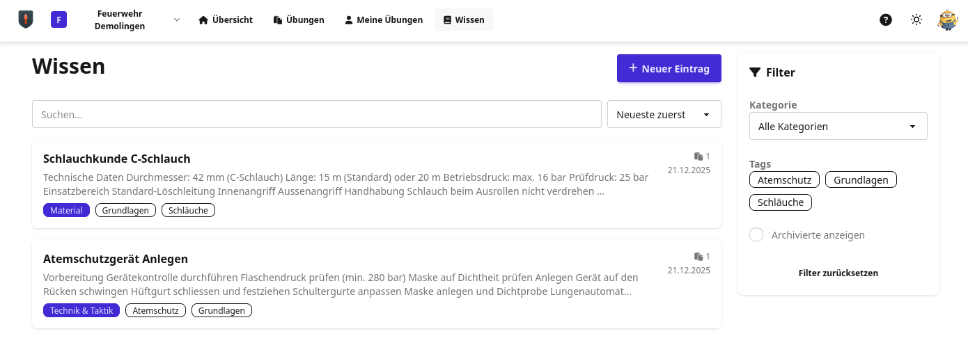 Das Feuerwehrhandwerk besteht aus viel Wissen, das während Übungen vermittelt wird. In der Wissensdatenbank lässt sich dieses Wissen strukturiert festhalten – mit Anhängen, externen Links, Tags und Kategorien. Die Volltextsuche durchsucht auch Anhänge.