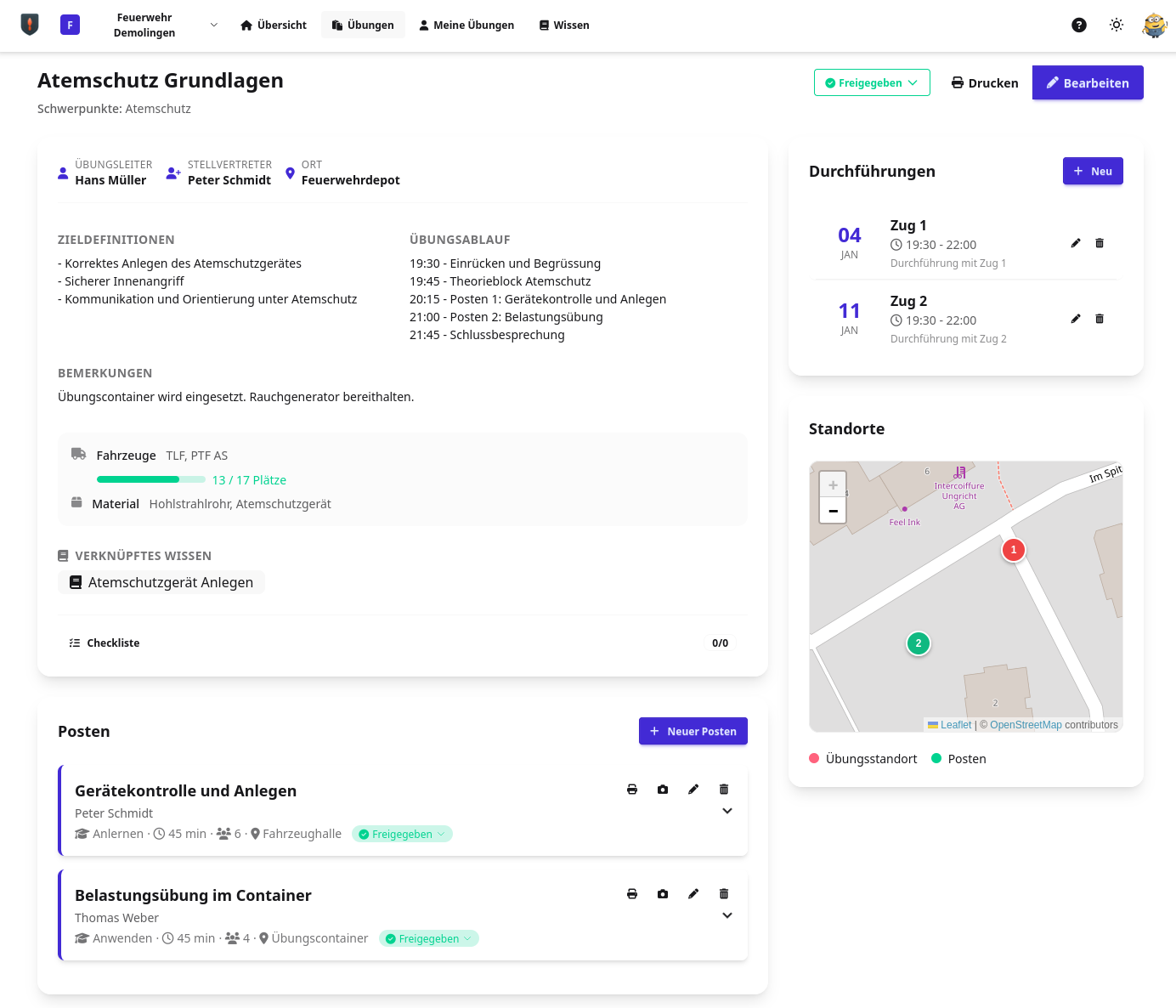 Eine Übung besteht oft aus verschiedenen Posten. Diese können beliebig erstellt und im Detail geplant werden: Postenleiter, Ziele, Dauer, Teilnehmerzahl, Standort, Material, verknüpftes Wissen und Fotos.