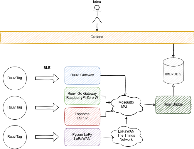 The Ruuvi Gateway is connected to the local Mosquitto MQTT broker, publishing the measurements there. Then RuuviBridge picks them up, processes them and stores the data in an InfluxDB 2 timeseries database. All of this is running on my little Kubernetes K3s machine.